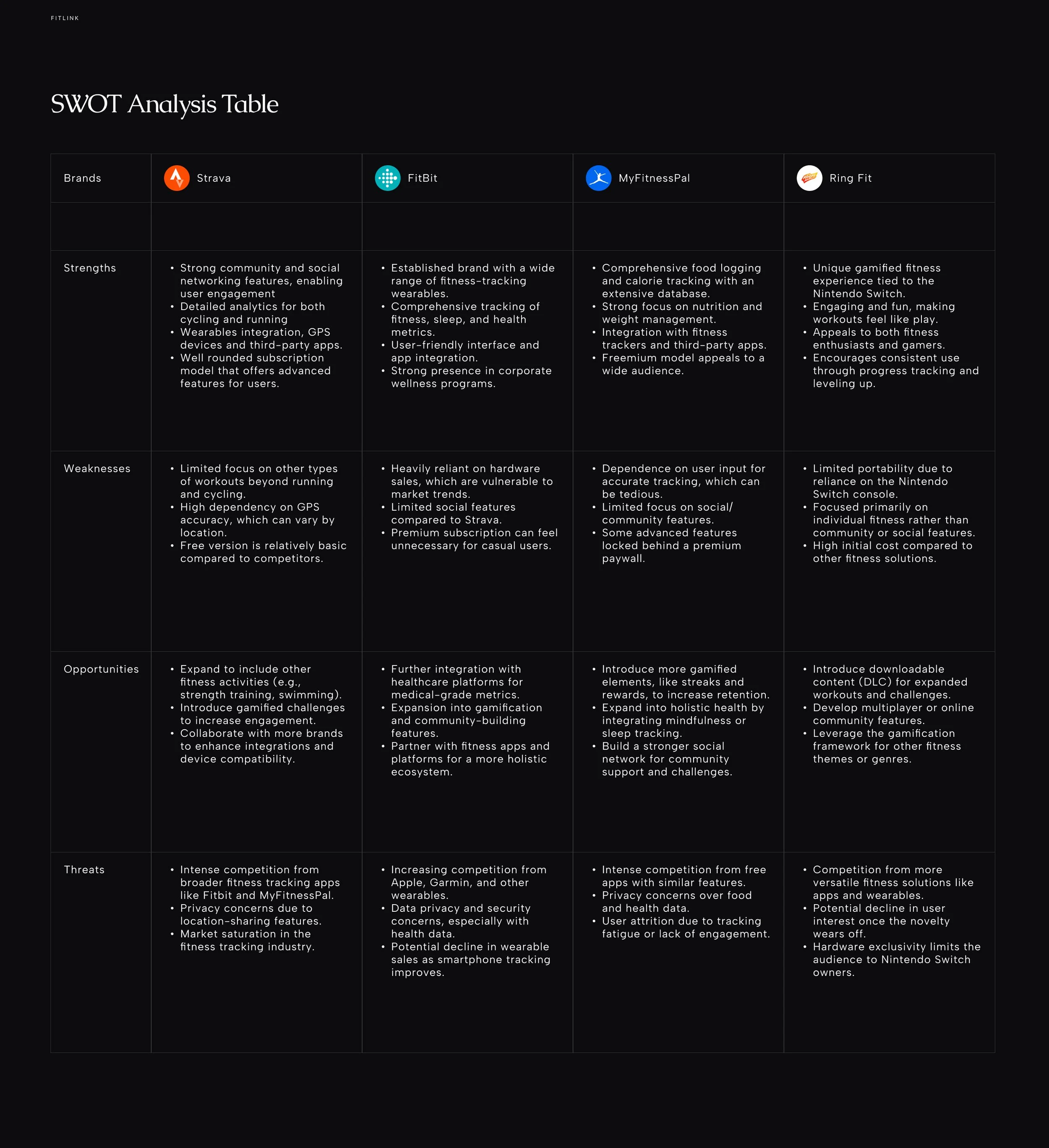 When it comes to the market surrounding fitness and wellness apps there are quite a few to look at, however in this case the top three on the Google Play Store were considered as they set the baseline for what features to expect and to understand what FitLink could leverage in its design. An additional selection was the Nintendo Switch's 'Ring Fit Adventure' seeing as they provided an innovative, out of the box solution to approaching more interactive fitness.