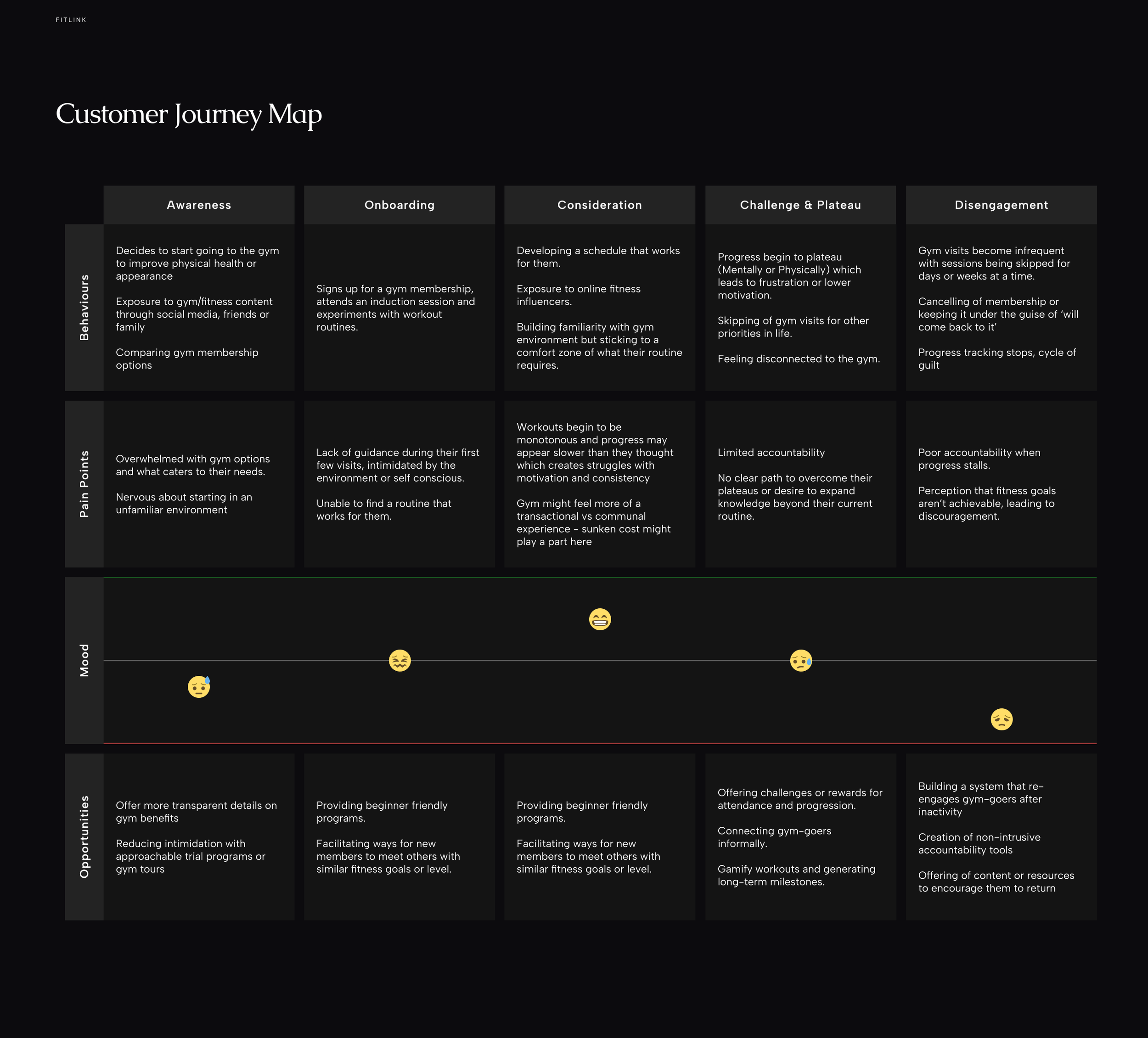 Keeping the research in consideration a customer journey map was then created based on an average gym attendees experience and examines what makes them susceptible to quitting or having reduction of their gym visits and barriers to long-term habit building.